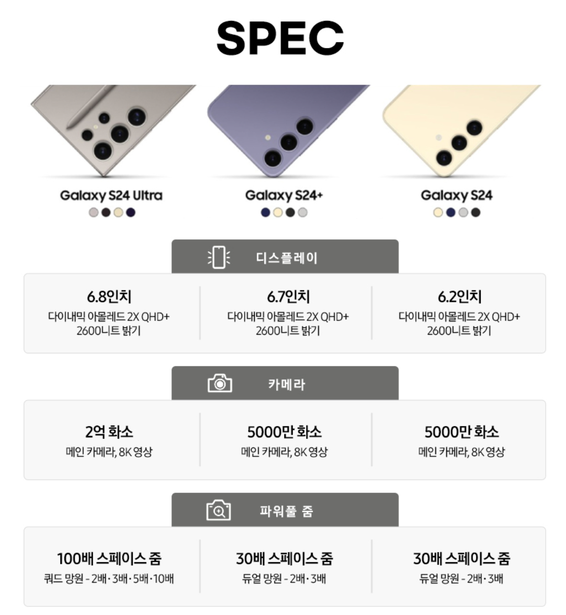 갤럭시 s24시리즈로 고민중이신데 [s24, s24+, s24 울트라]가 스펙면에서 어떤 차이점이 있는지 궁금하신가요? 그래서 준비했습니다. 갤럭시 s24 시리즈의 스펙!!