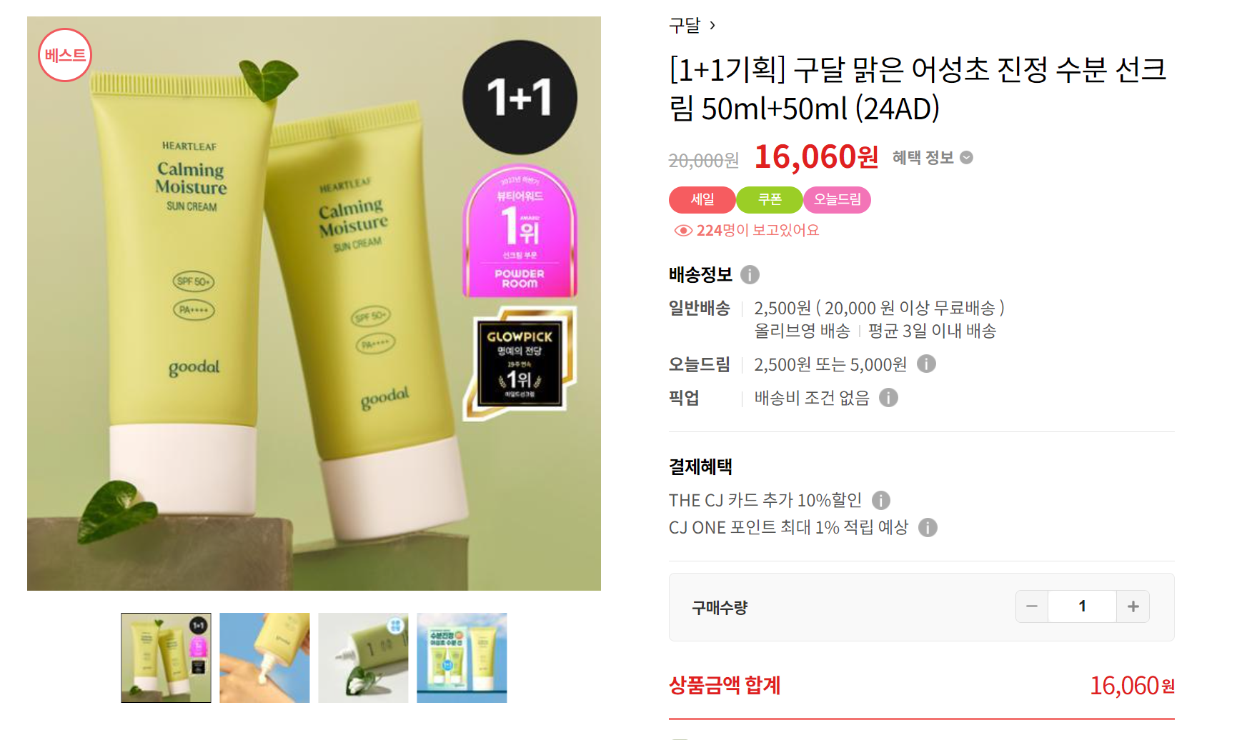 보통 올리브영에서 1+1으로 판매한다. 1개씩 판매하는 건 못봤다.(내가 못 본 것 일 수도 있다) 어차피 여름에 많이 얼굴에도 바르고 몸에도 바르고 하니까 괜찮은 것 같다. 나는 18000원에 산 것으로 기억하는 데 지금은 16060원에 판매하고 있다. (이런.. 더 저렴해졌다.)