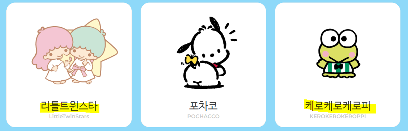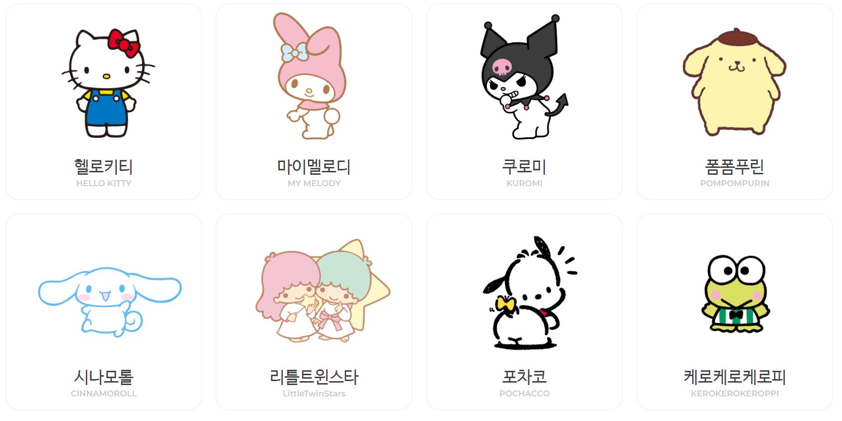 조금 더 알아야한다면(?) 리틀트윈스타와 케로케로케로피가 있어요. 하지만 아이들 사이에서는 그렇게까지 인기가 높은 편은 아니랍니다. 크게 6개의 캐릭터들(키티, 쿠로미, 마이멜로디, 폼폼푸린, 포차코, 시나모롤)만 알아도 충분해요!!