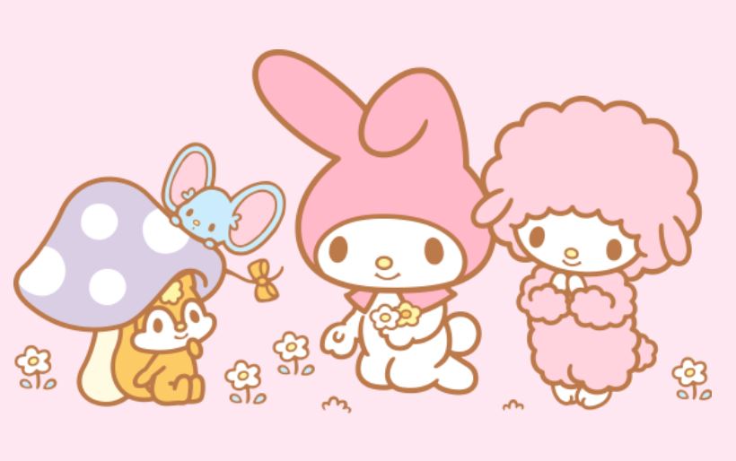저기 가장 중간에 있는 캐릭터 이름이 '마이멜로디'입니다. 토끼처럼 보이지만 사실 할머니가 만들어준 두건이래요. 키티처럼 쿠키 만들고 굽는 걸 좋아하는 여자아이랍니다.