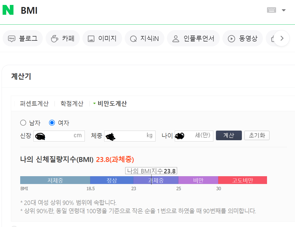이렇게 BMI 계산기를 이용하면 내 몸무게의 정상 범위를 알 수 있습니다. 네..저는 과체중으로 나오네요. 당장 오늘부터(내일부터 X) 다이어트 들어갈 예정입니다. 중요한 건, 스트레스 받아가면서 미용 목적으로 살을 빼라는 게 아니라, '나의 건강을 위해서'라는 마인드로 몸무게를 조절하는 것 입니다. 완전 저체중이면 좋아보이지 않습니다. 저체중이라고 다 좋은 게 아니고 오히려 건강을 헤칠 수 있습니다.