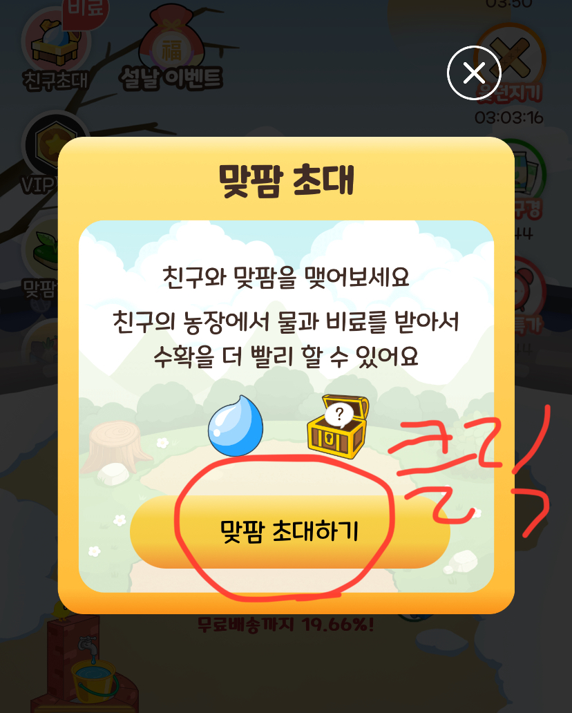 3번을 하셨다면 이렇게 맞팜 초대하기가 뜹니다. 이럴때는 클릭을 해주세요.