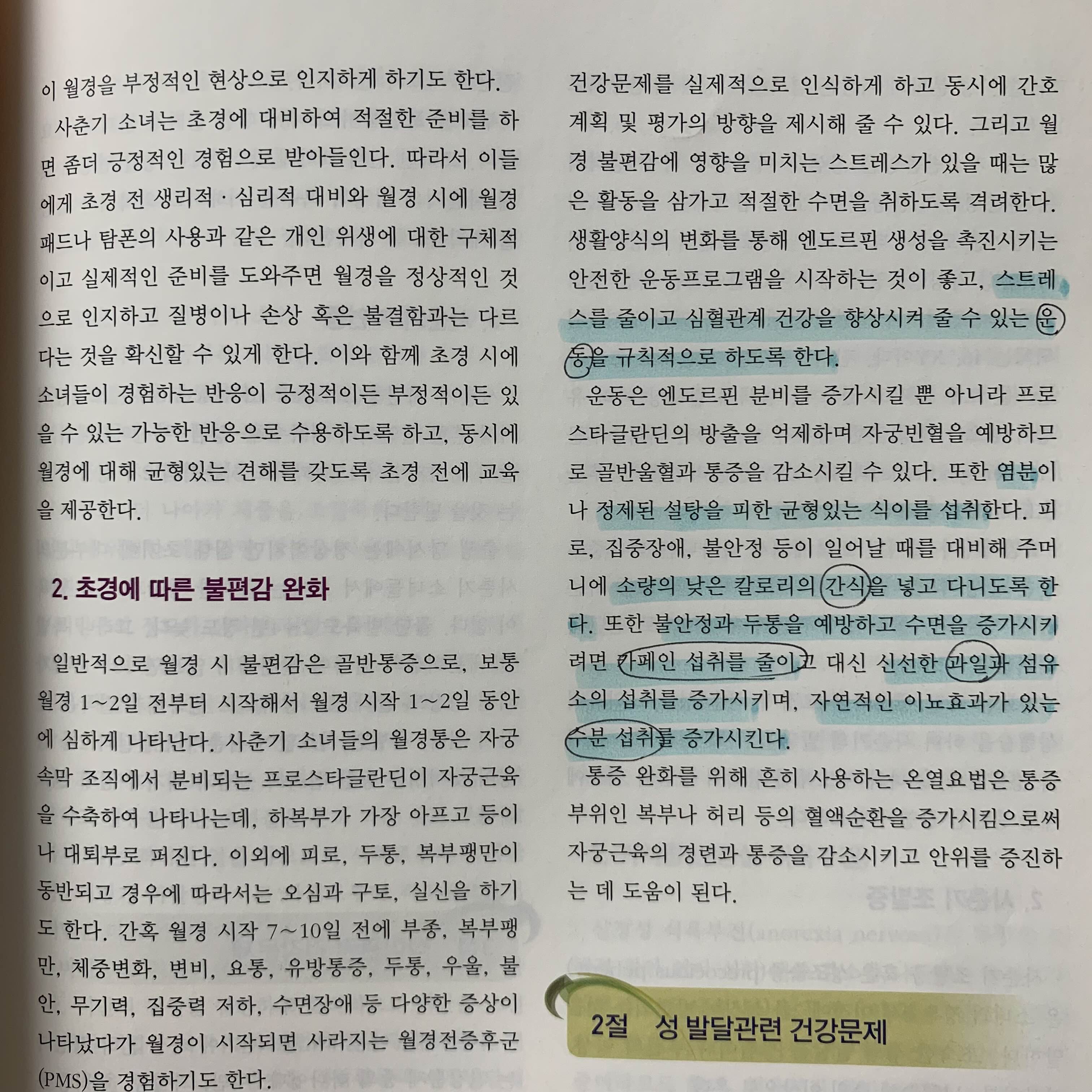 - 월경 전 불편감을 완화시키려면 월경주기에 대하여 교육하고 자신의 증상을 기록하고 평가할 수 있도록 워력ㅇ증상기록지를 제공한다. 이것은 소녀가 자신의 건강문제를 실제적으로 인식하게 하고 동시에 간호계획 및 평가의 방향을 제시해 줄 수 있다. 그리고 월경 불편감에 영향을 미치는 스트레스가 있을 때는 많은 활동을 삼가고 적절한 수면을 취하도록 격려한다.