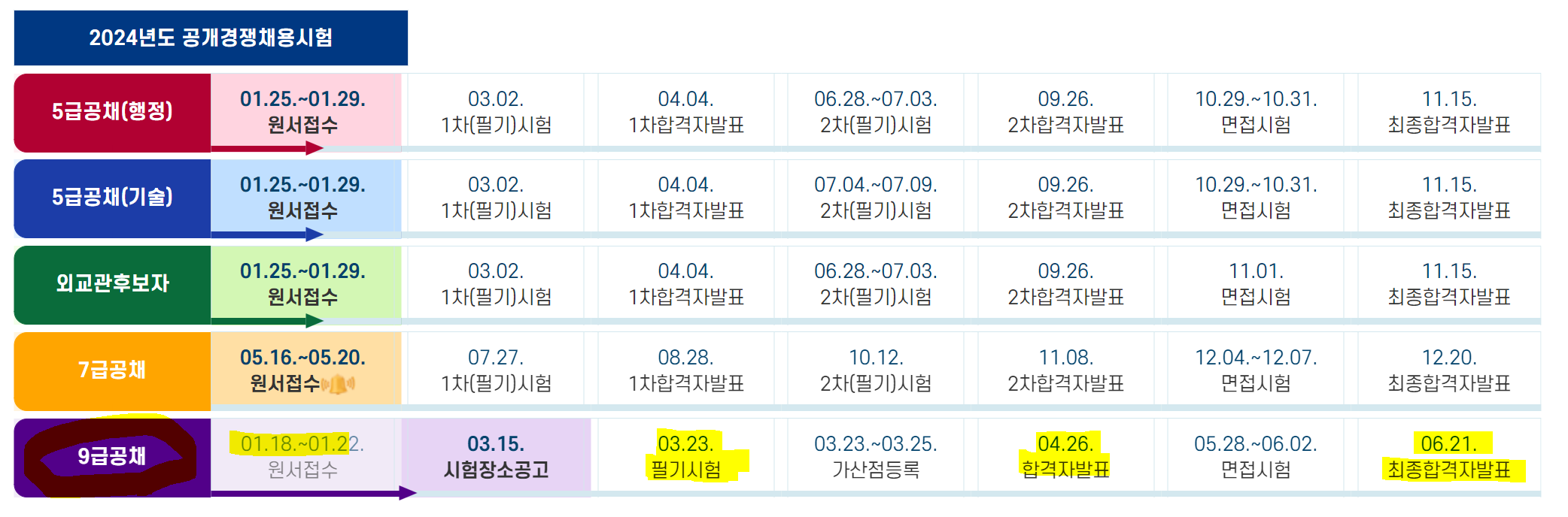 2024년도 기준, 9급 공채 원서접수 시험일정은 2024.03.23(토)이다.